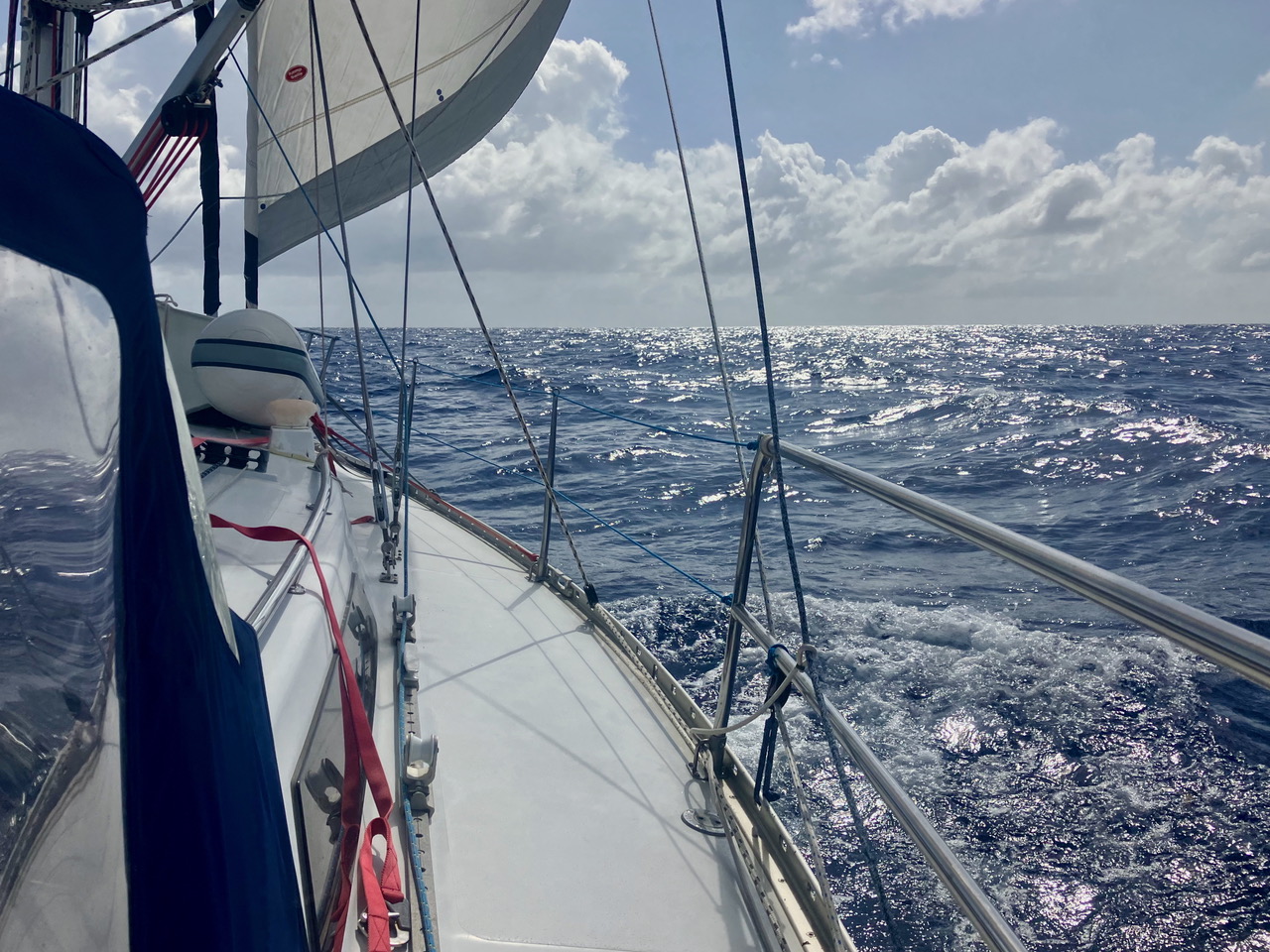 At noon today we were at 15 220N 068 09W steering 245M, sailing under 2 reefs and 1 furl at 5 knots. The wind was 16G20 from the E. Our noon to noon distance over the ground was 123nm. Distance to go was 764nm.